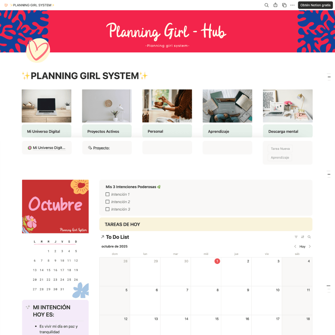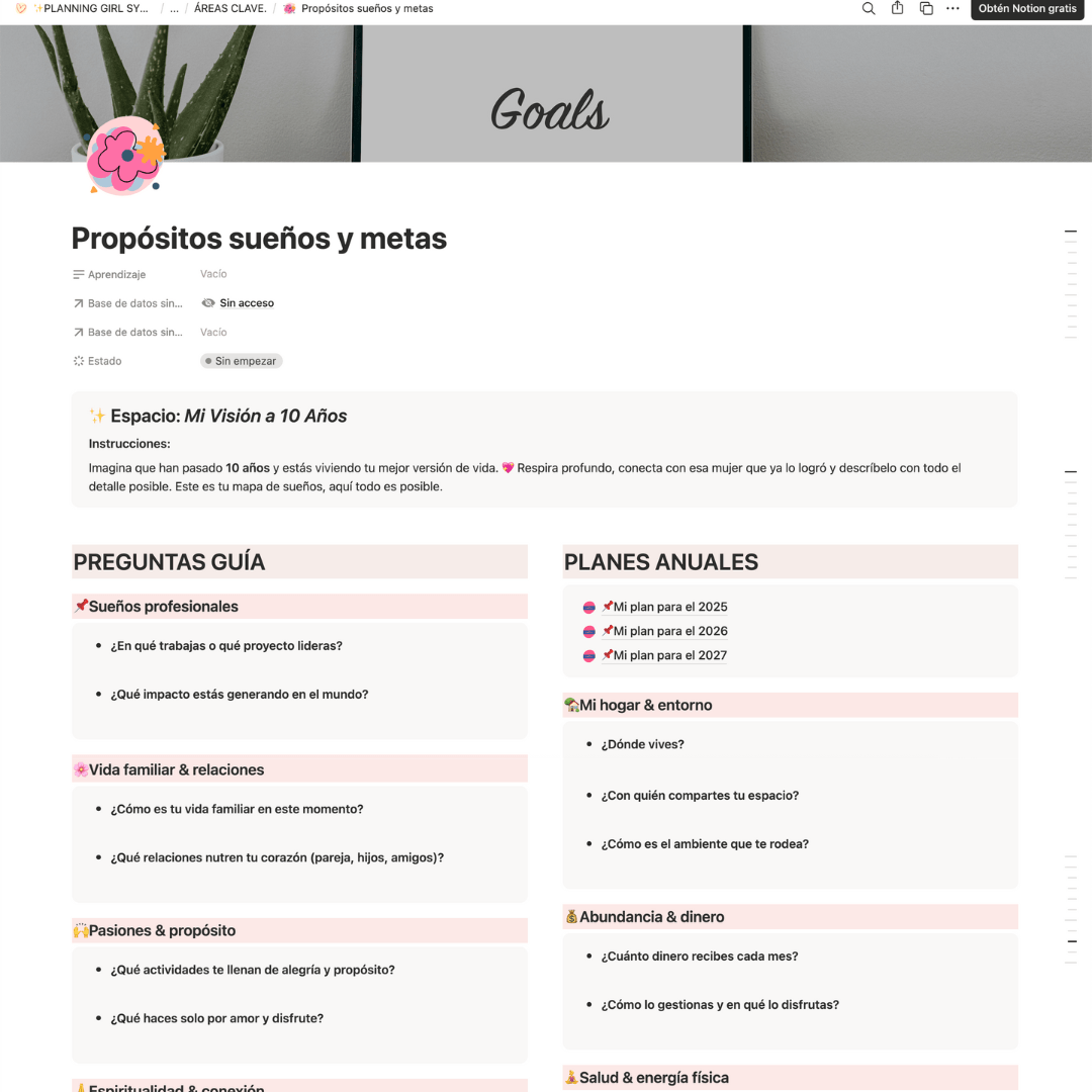 Planning Girl System es tu sistema de organización digital y holístico en Notion, diseñado para que dejes de improvisar y empieces a cumplir tus metas, organizar tu vida y crear hábitos que se mantienen.👇